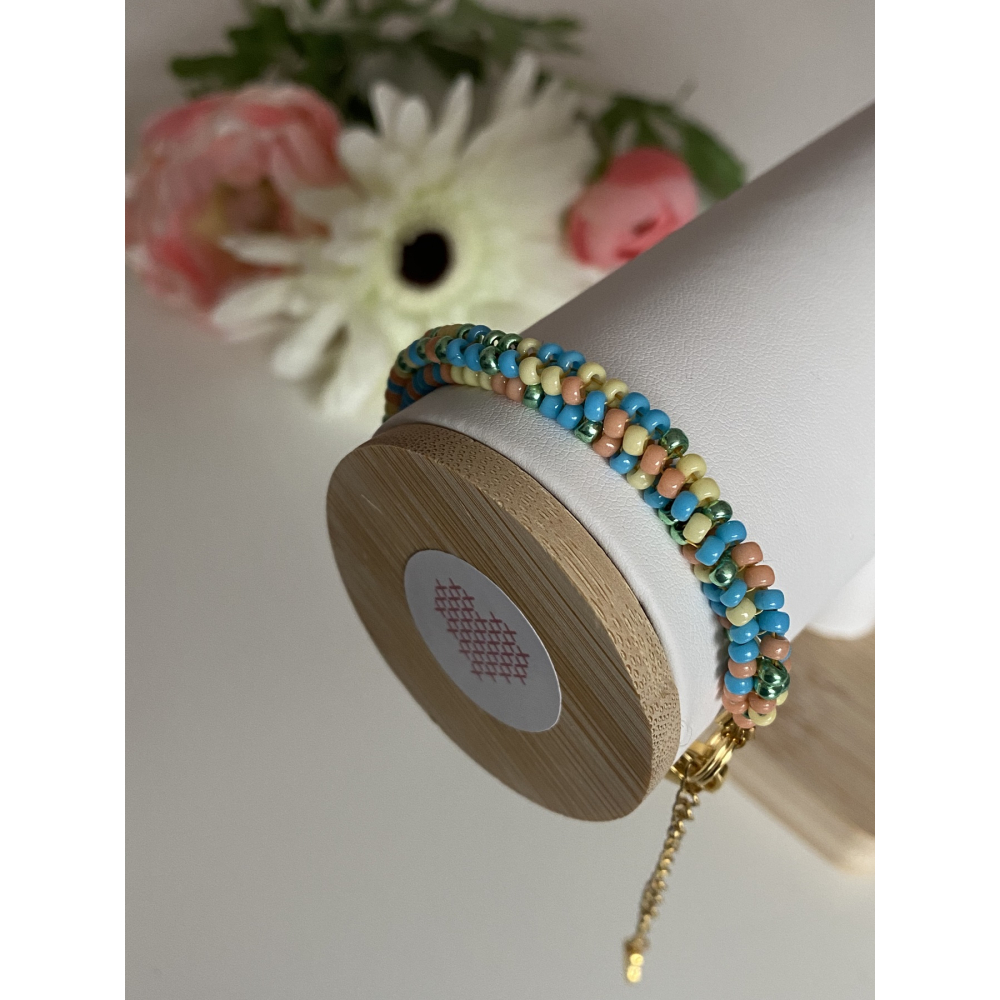 De armband is geregen op stevig nylondraad en afgewerkt met RVS materialen.