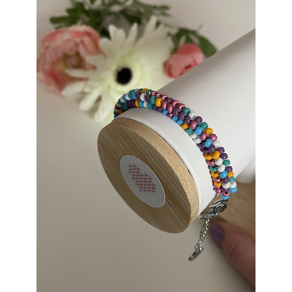 De armband is geregen op stevig nylondraad en afgewerkt met RVS materialen.