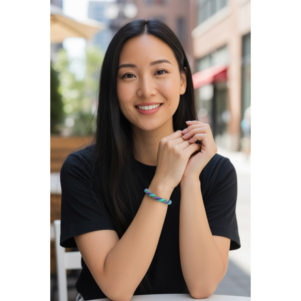 De armband past om vrijwel iedere pols omdat hij gemakkelijk over je hand rolt.