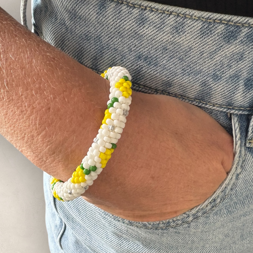 De armband past om vrijwel iedere pols omdat hij gemakkelijk over je hand rolt.